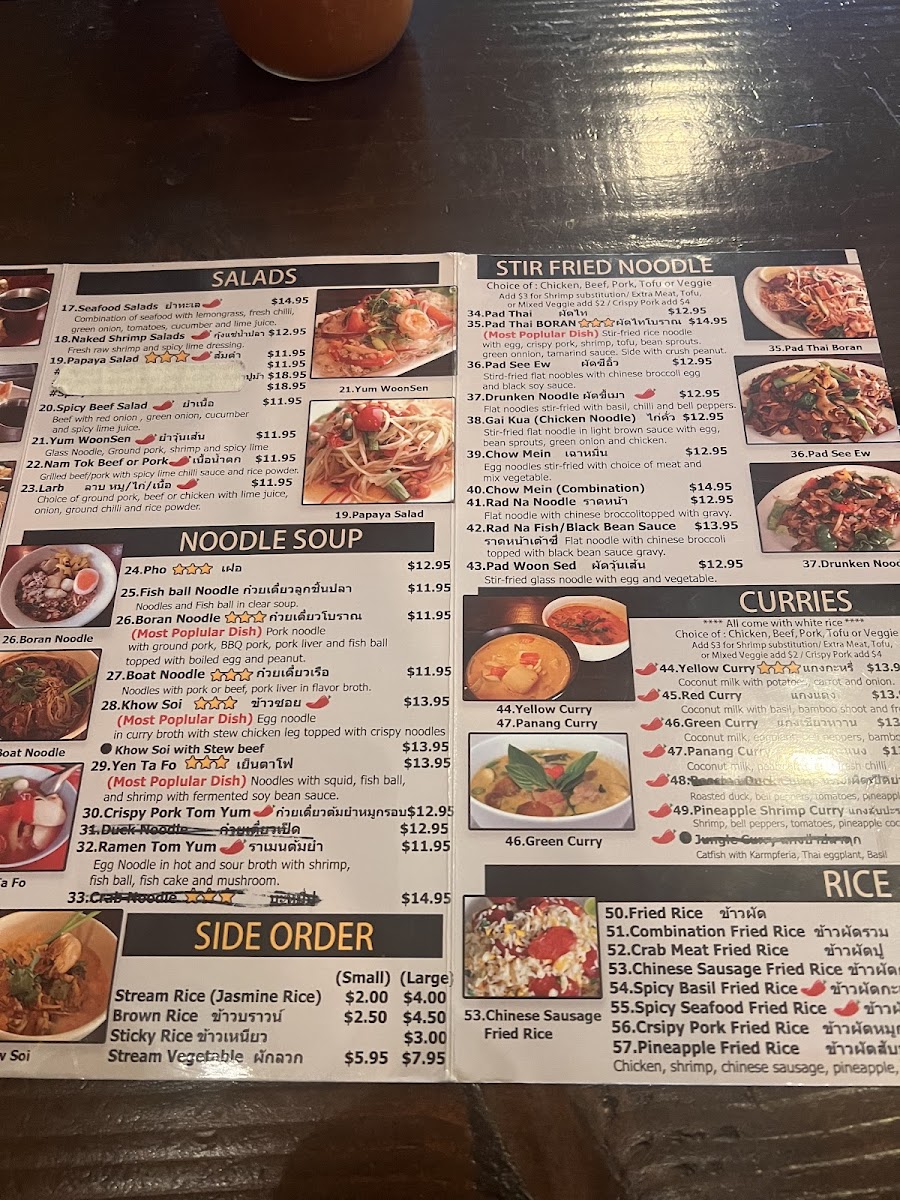 Rice noodles with crispy pork, ground pork top with boiled egg and peanut served in the tom yum broth.